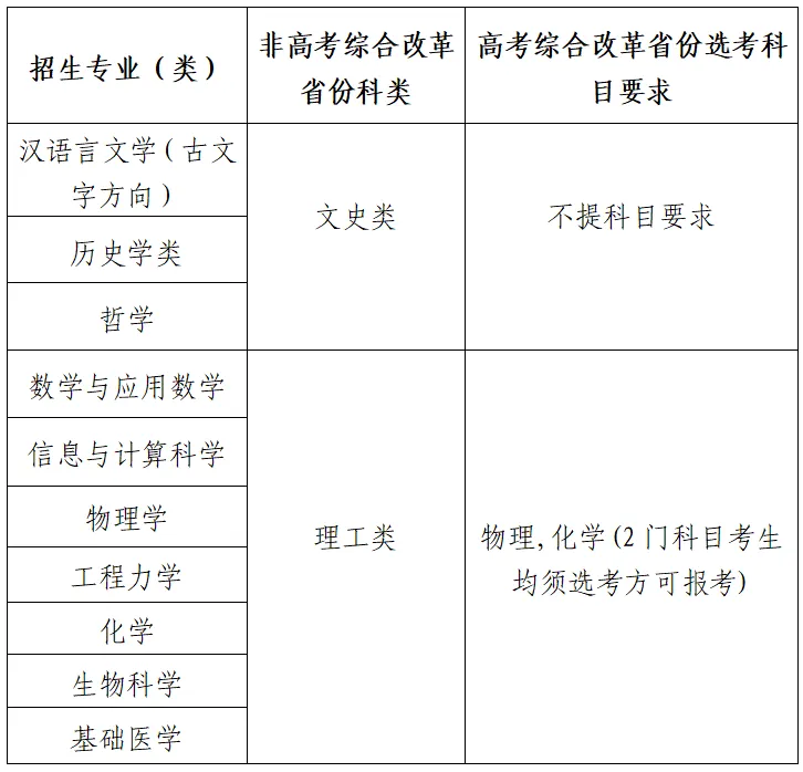四川大學(xué)強(qiáng)基計(jì)劃招生專業(yè)為漢語言文學(xué)(古文字方向)、歷史學(xué)類(含歷史學(xué)、考古學(xué)、文物與博物館學(xué)專業(yè))、哲學(xué)、數(shù)學(xué)與應(yīng)用數(shù)學(xué)、信息與計(jì)算科學(xué)、物理學(xué)、工程力學(xué)、化學(xué)、生物科學(xué)、基礎(chǔ)醫(yī)學(xué)。