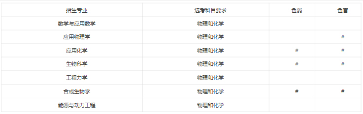 我校招生專業(yè)包括數(shù)學與應用數(shù)學、應用物理學、應用化學、生物科學、工程力學、合成生物學、能源與動力工程。所有招生專業(yè)在非高考改革省份招收理科考生,在高考改革省份選考科目要求見下表:
