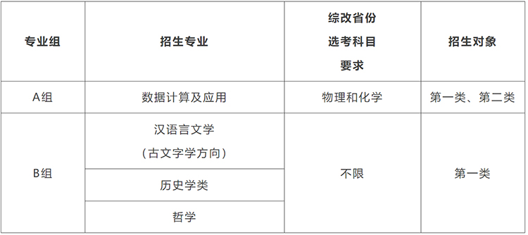 我校強基計劃招生專業(yè)為數(shù)據(jù)計算及應(yīng)用、漢語言文學(古文字學方向)、歷史學類、哲學??忌傻卿泩竺到y(tǒng)查看我校2025年分省(區(qū)、市)強基計劃招生專業(yè)及招生計劃;第二類考生單列計劃。