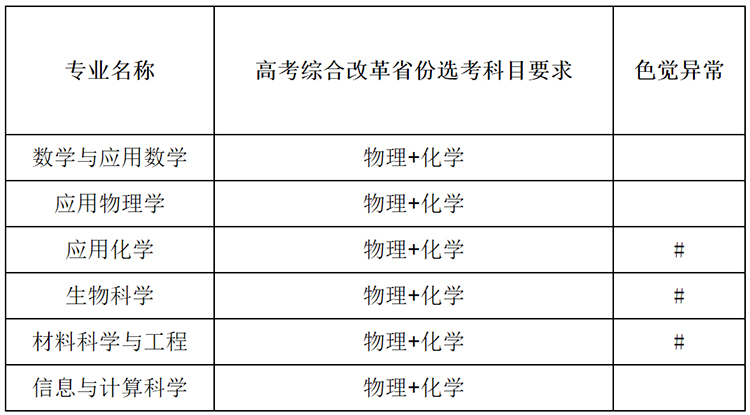 2.對(duì)考生身體健康狀況的要求執(zhí)行教育部、原衛(wèi)生部、中國殘疾人聯(lián)合會(huì)制定并下發(fā)的《普通高等學(xué)校招生體檢工作指導(dǎo)意見》中的規(guī)定。標(biāo)記“#”的專業(yè)不招收相關(guān)色覺異常(色盲、色弱、單色不能識(shí)別)考生。