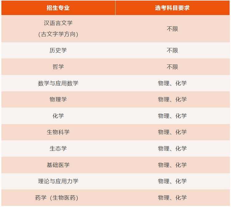 (一)強(qiáng)基計(jì)劃招生專業(yè)包括漢語言文學(xué)(古文字學(xué)方向)、歷史學(xué)、哲學(xué)、數(shù)學(xué)與應(yīng)用數(shù)學(xué)、物理學(xué)、化學(xué)、生物科學(xué)、生態(tài)學(xué)、基礎(chǔ)醫(yī)學(xué)、理論與應(yīng)用力學(xué)、藥學(xué)(生物醫(yī)藥)。各專業(yè)選考科目要求如下: