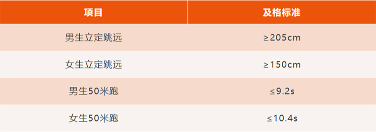 2.考生需參加由我校組織的體育測試,測試項(xiàng)目可自主選擇立定跳遠(yuǎn)或50米跑。體育測試不受理緩考、補(bǔ)考申請。體育測試及格標(biāo)準(zhǔn)如下: