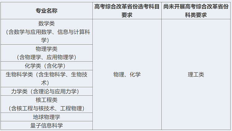(一)我校2025年強基計劃招生專業(yè)包括:數(shù)學類(含數(shù)學與應用數(shù)學、信息與計算科學)、物理學類(含物理學、應用物理學)、化學類(含化學)、生物科學類(含生物科學、生物技術)、力學類(含理論與應用力學)、核工程類(含核工程與核技術、工程物理)、地球物理學、量子信息科學。