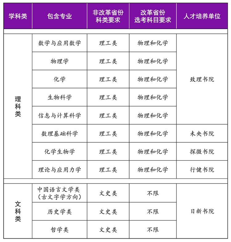 基礎(chǔ)文科類專業(yè)包括:中國語言文學(xué)類(古文字學(xué)方向)、歷史學(xué)類、哲學(xué)類專業(yè),旨在選拔并培養(yǎng)在基礎(chǔ)文科領(lǐng)域有特長且有志于從事相關(guān)研究的學(xué)生。