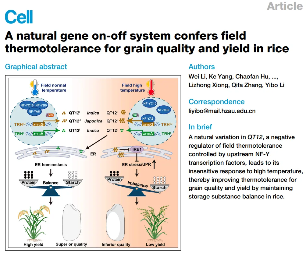 北京時(shí)間4月30日,國(guó)際期刊《細(xì)胞》(Cell)發(fā)表了華中農(nóng)業(yè)大學(xué)作物遺傳改良全國(guó)重點(diǎn)實(shí)驗(yàn)室、生命科學(xué)技術(shù)學(xué)院、湖北洪山實(shí)驗(yàn)室水稻團(tuán)隊(duì)李一博教授課題組題為“一個(gè)天然的基因開(kāi)關(guān)系統(tǒng)協(xié)同賦予水稻品質(zhì)和產(chǎn)量田間耐熱性”(A natural gene on-off system confers field thermotolerance for grain quality and yield in rice)的研究論文。
