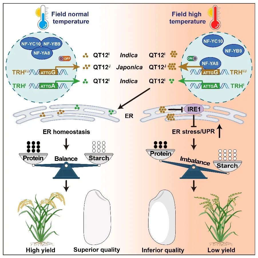 該研究首次揭示了水稻對(duì)抗高溫的秘密武器——基因QT12。它如同作物內(nèi)置天然“空調(diào)系統(tǒng)”,調(diào)節(jié)水稻耐高溫機(jī)制。當(dāng)高溫來(lái)襲,QT12自然變異與NF-Y蛋白復(fù)合體形成的初級(jí)-次級(jí)“雙生鎖”,鎖住高溫開(kāi)關(guān)系統(tǒng),既平衡了儲(chǔ)藏蛋白與淀粉的合成穩(wěn)態(tài),又穩(wěn)定了稻米品質(zhì)和產(chǎn)量,為水稻在高溫環(huán)境下的同時(shí)實(shí)現(xiàn)優(yōu)質(zhì)高產(chǎn)提供了全新的分子機(jī)制和綠色發(fā)展的育種策略。
