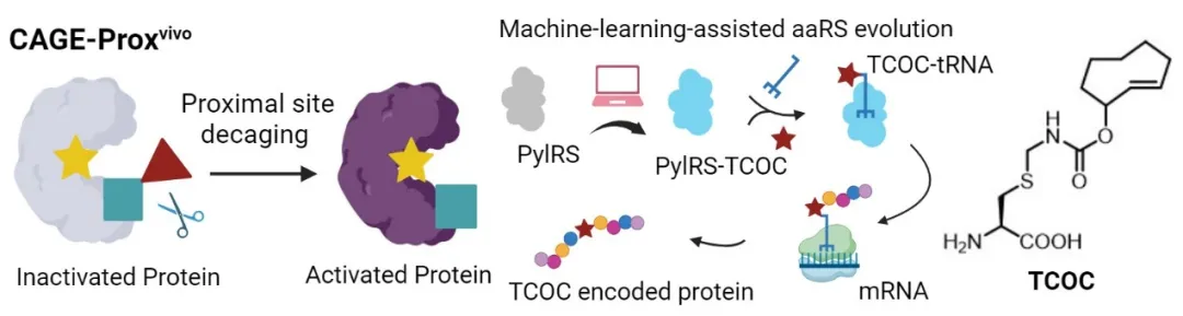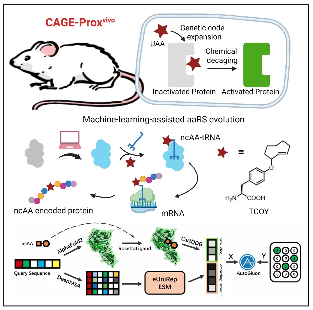 機(jī)器學(xué)習(xí)驅(qū)動的蛋白質(zhì)活體激活策略:通過蛋白語言模型訓(xùn)練機(jī)器學(xué)習(xí)算法,設(shè)計(jì)和篩選tRNA合成酶(PylRS)變體,實(shí)現(xiàn)了可化學(xué)脫籠的反式環(huán)辛烯-酪氨酸(TCOY)的識別和編碼表達(dá),用于后續(xù)在體蛋白質(zhì)功能激活和互作調(diào)控