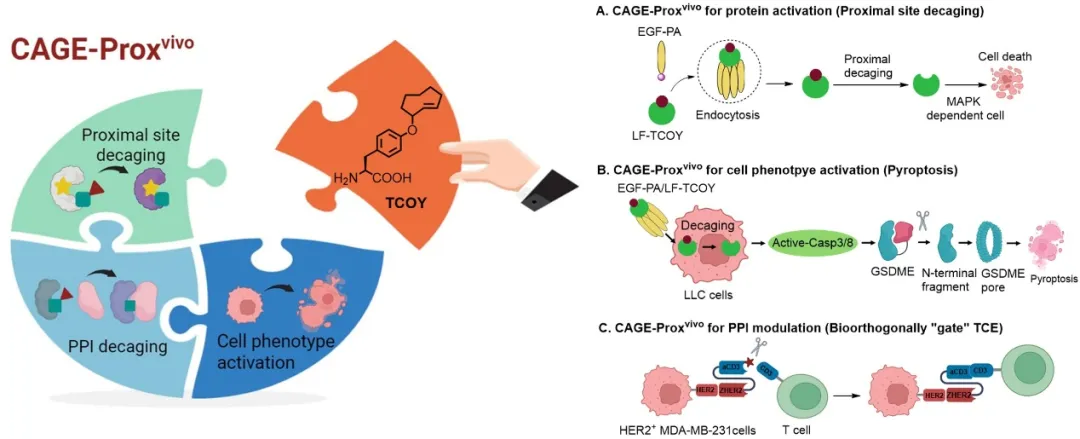 CAGE-Proxvivo蛋白質(zhì)活體原位激活通用平臺應(yīng)用:在活體動物中按需激活蛋白質(zhì)功能;調(diào)節(jié)細(xì)胞表型,誘導(dǎo)腫瘤細(xì)胞發(fā)生焦亡,增強(qiáng)抗腫瘤免疫反應(yīng);精確調(diào)節(jié)蛋白質(zhì)-蛋白質(zhì)相互作用,實(shí)現(xiàn)生物正交“門控”雙特異性抗體,用于按需招募和激活T細(xì)胞