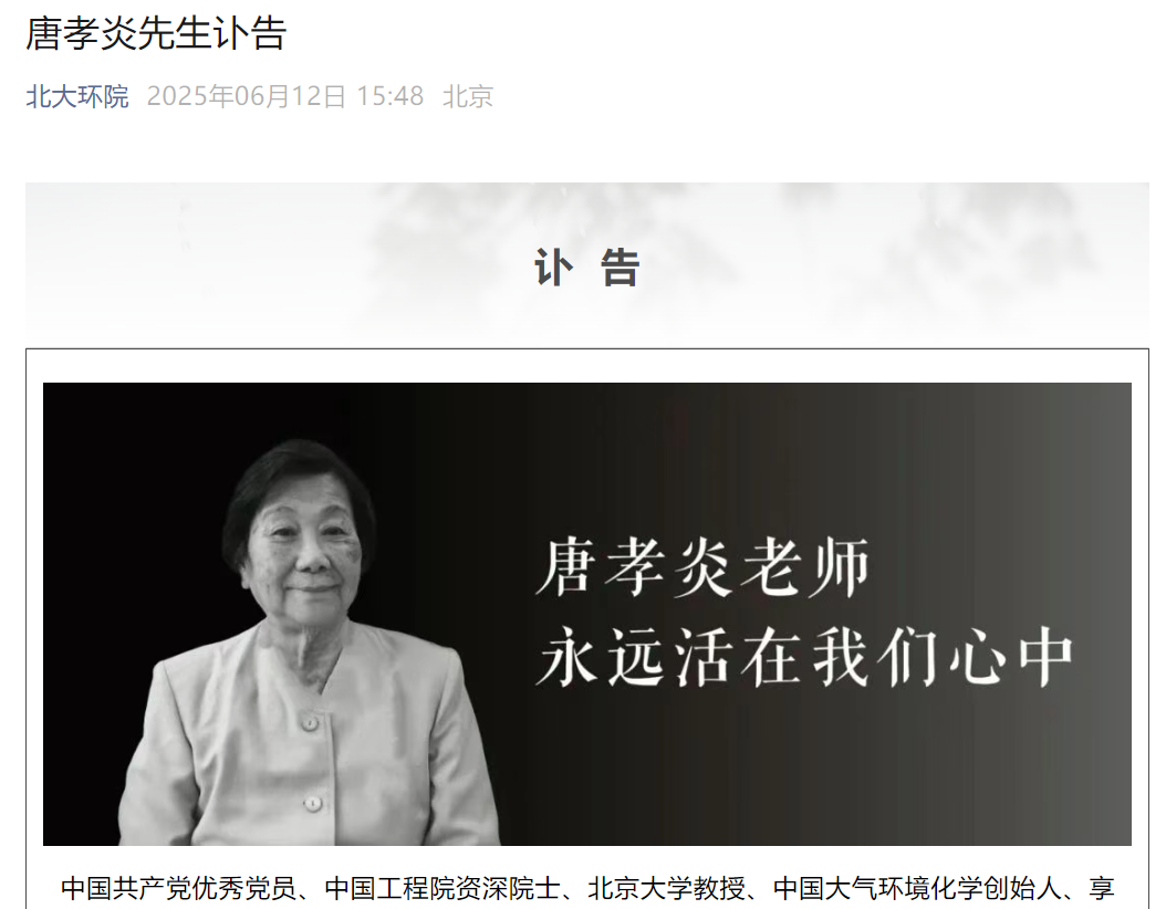 6月12日,北京大學環(huán)境科學與工程學院公眾號發(fā)布訃告:中國共產(chǎn)黨優(yōu)秀黨員、中國工程院資深院士、北京大學教授、中國大氣環(huán)境化學創(chuàng)始人、享有國際盛譽的環(huán)境科學家與大氣化學家唐孝炎先生因病醫(yī)治無效,于2025年6月11日16時在北京逝世,享年93歲。