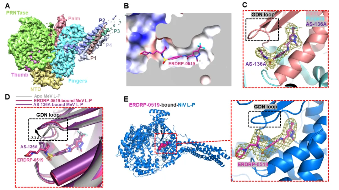 圖1. 非核苷類抑制劑抑制麻疹病毒及尼帕病毒聚合酶的分子機(jī)制。(A) 麻疹病毒L-P復(fù)合物冷凍電鏡重構(gòu)圖;(B) ERDRP-0519結(jié)合麻疹病毒L-P復(fù)合物的分子細(xì)節(jié);(C) AS-136A結(jié)合麻疹病毒L-P復(fù)合物的分子細(xì)節(jié);(D) 非核苷類抑制劑誘導(dǎo)麻疹病毒聚合酶發(fā)生構(gòu)象變化;(E) ERDRP-0519結(jié)合尼帕病毒L-P復(fù)合物分子細(xì)節(jié)