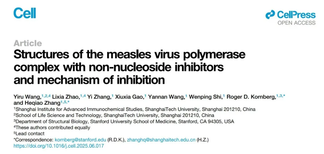 7月7日,國際學(xué)術(shù)期刊《細(xì)胞》(Cell)在線發(fā)表了上海科技大學(xué)免疫化學(xué)研究所張賀橋與諾貝爾獎得主羅杰·科恩伯格(Roger Kornberg)團(tuán)隊的研究成果。該研究首次揭示了非核苷類抑制劑有效抑制麻疹病毒和尼帕病毒RNA聚合酶復(fù)合物活性的分子機(jī)制,為應(yīng)對這兩種全球性傳染病的抗病毒藥物研發(fā)提供了關(guān)鍵科學(xué)基礎(chǔ)。
