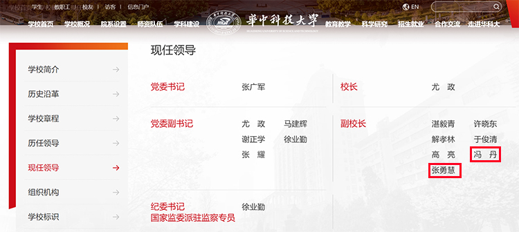 7月5日,華中科技大學(xué)官網(wǎng)“現(xiàn)任領(lǐng)導(dǎo)”一欄更新,馮丹、張勇慧已任學(xué)校副校長。
