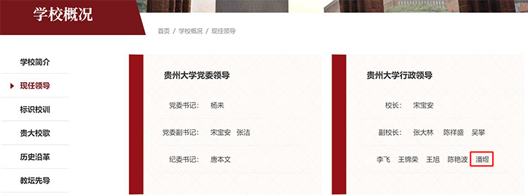 近日,據(jù)貴州大學(xué)官網(wǎng)“現(xiàn)任領(lǐng)導(dǎo)”一欄更新顯示,潘煜已任貴州大學(xué)副校長(掛職)。