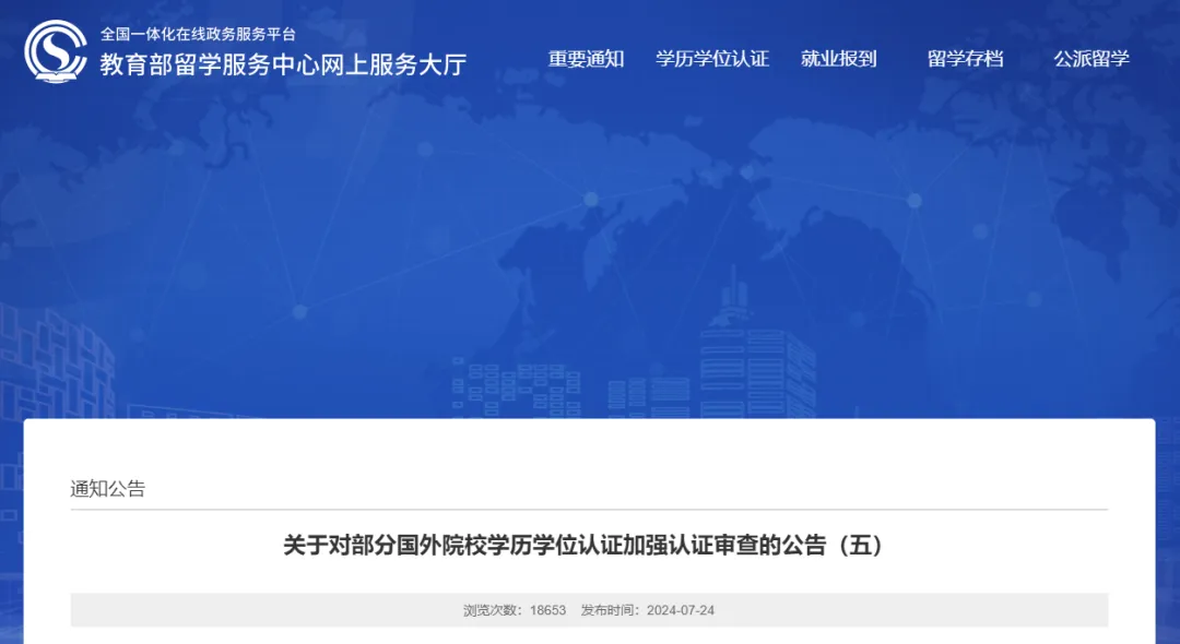 7月24日,教育部留學(xué)服務(wù)中心發(fā)布《關(guān)于對(duì)部分國(guó)外院校學(xué)歷學(xué)位認(rèn)證加強(qiáng)認(rèn)證審查的公告(五)》,對(duì)部分國(guó)外院校學(xué)歷學(xué)位認(rèn)證加強(qiáng)認(rèn)證審查。