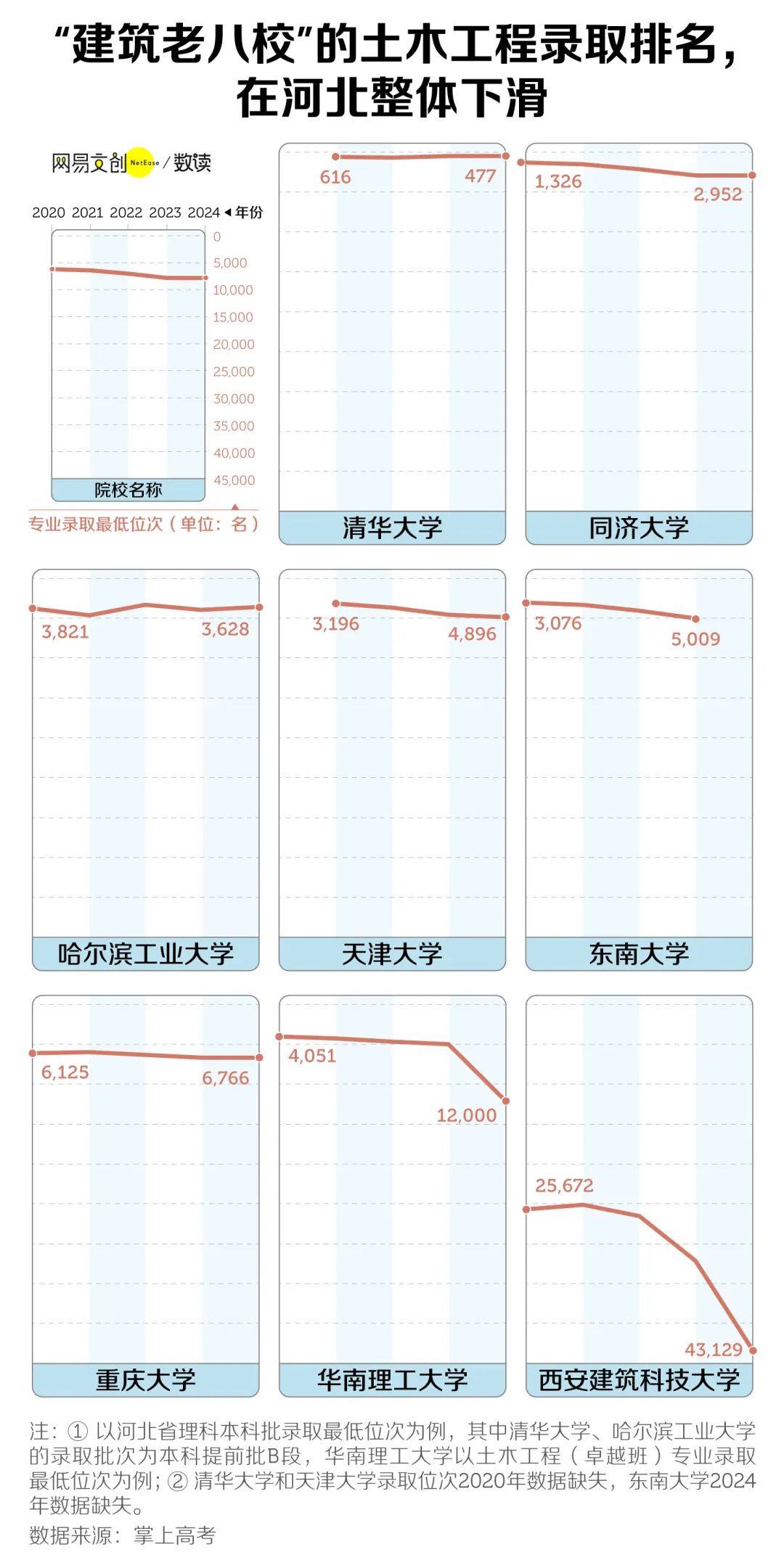 2020年以來,在土木業(yè)內(nèi)擁有重大影響力的“建筑老八?!痹诤颖钡母呖间浫≈校饲迦A大學(xué)、哈工大的最低錄取名次在“悶聲”回升外,其他學(xué)校的錄取位次大多有所下跌。相較往年,2024年華南理工大學(xué)在河北的最低錄取位次掉落了近七千名,西安建筑科技大學(xué)更是暴跌一萬多名。