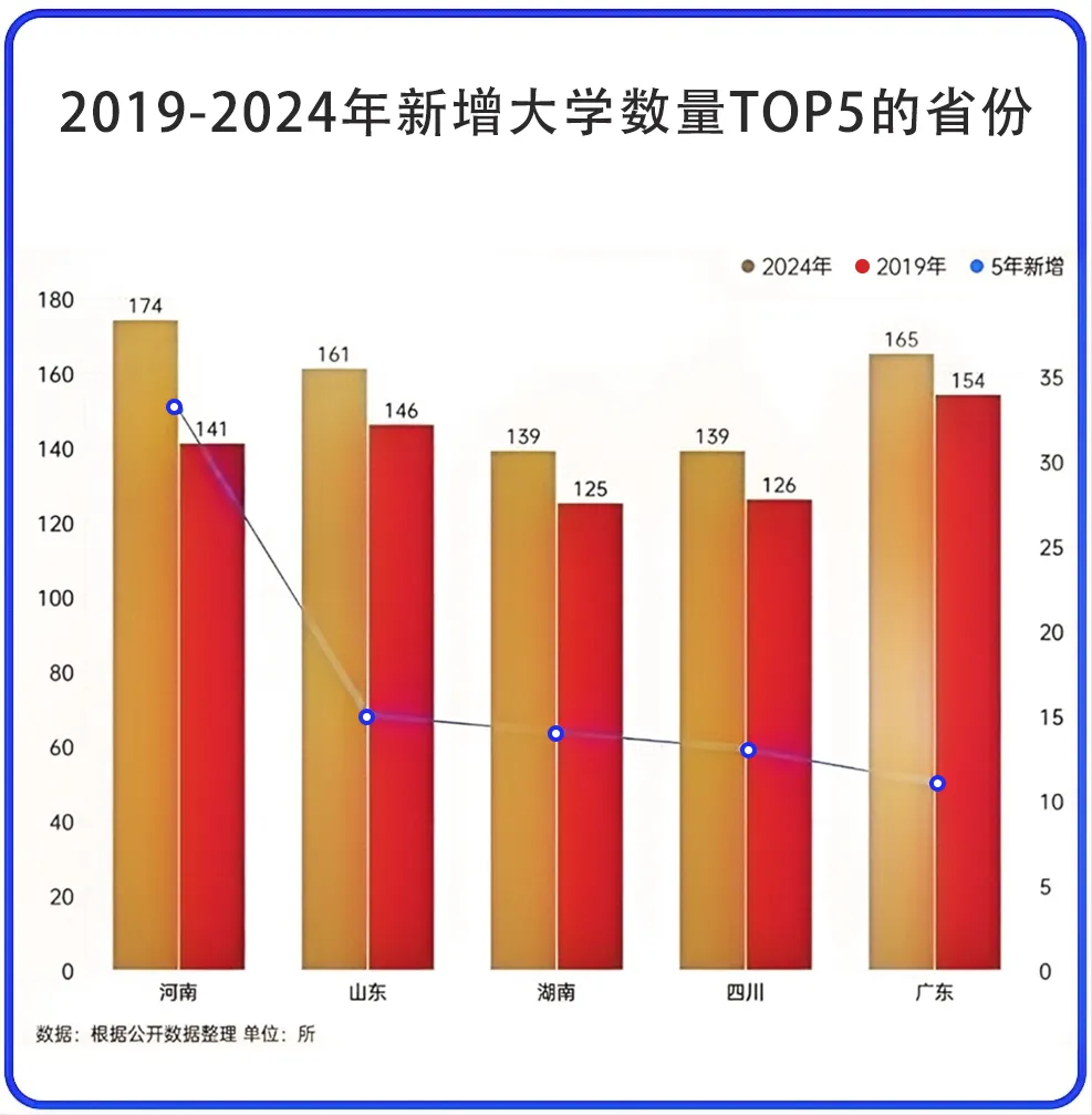 據(jù)教育部公布的統(tǒng)計(jì)數(shù)據(jù),2019年,河南的高校數(shù)量為141所,短短5年間,大幅增加到174所,猛增33所,平均每年新增6.6所大學(xué),增長(zhǎng)速度驚人。