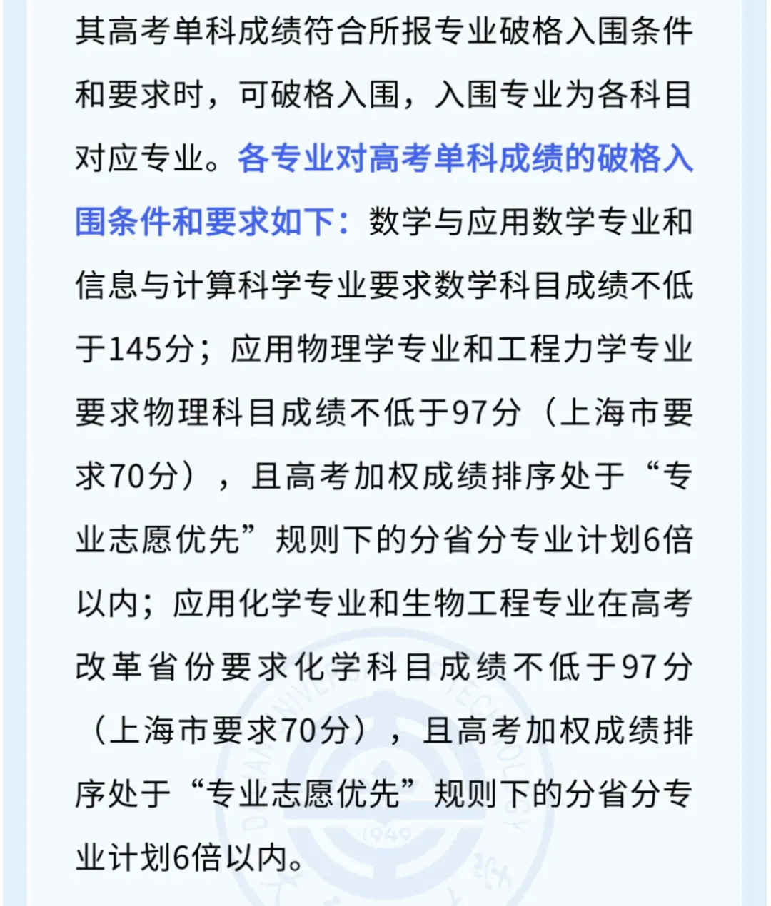與此同時(shí),今年的強(qiáng)基計(jì)劃繼續(xù)強(qiáng)調(diào)數(shù)學(xué)、物理等學(xué)科的重要性,部分高校單科成績(jī)滿分可破格入圍。