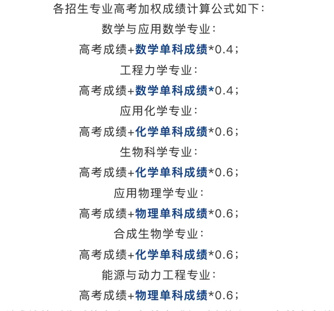 如天津大學(xué)在強(qiáng)調(diào)單科成績(jī)突出可破格入圍的同時(shí),根據(jù)不同專業(yè)對(duì)高考成績(jī)中數(shù)學(xué)、物理、化學(xué)的權(quán)重進(jìn)行加權(quán)計(jì)算。