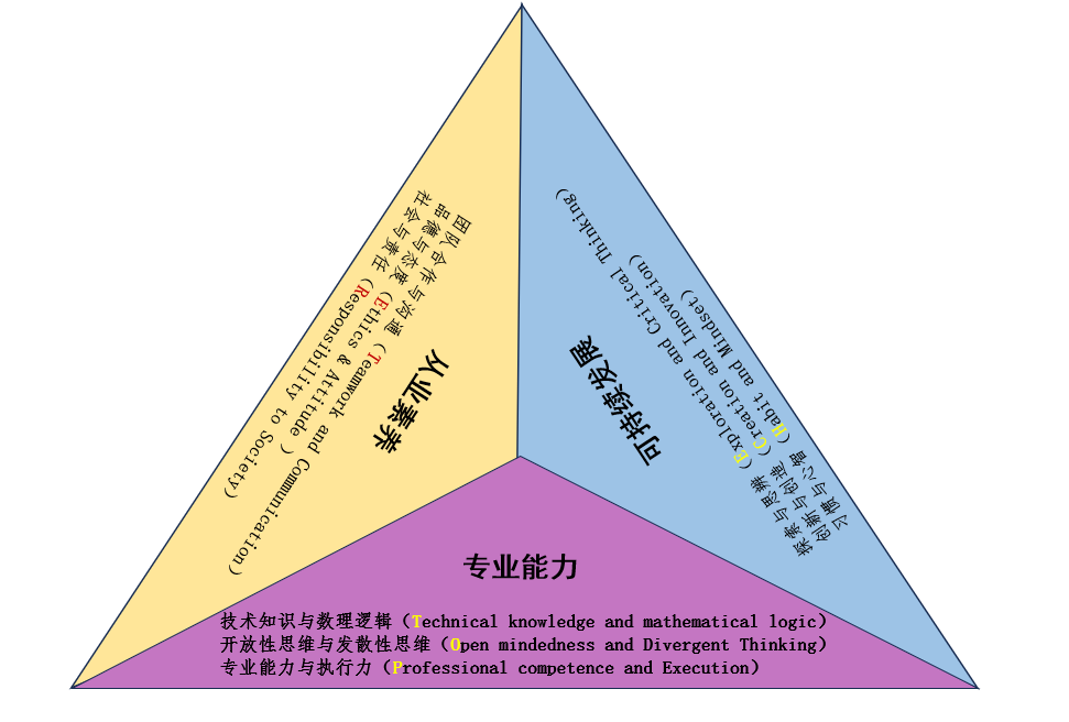 信息文明時(shí)代,我們應(yīng)該構(gòu)建了專(zhuān)業(yè)能力、從業(yè)素養(yǎng)和可持續(xù)發(fā)展“三棱錐”圖譜,圍繞知識(shí)探索、能力建設(shè)、人格塑造三要素構(gòu)建“TOPTECHER”核心能力模型。“三棱錐”中的專(zhuān)業(yè)能力主要包含以下三個(gè)指標(biāo):技術(shù)知識(shí)與數(shù)理邏輯(Technical knowledge and mathematical logic),開(kāi)放性思維與發(fā)散性思維(Open mindedness and Divergent Thinking),專(zhuān)業(yè)能力與執(zhí)行力(Professional Competence and Execution);在從業(yè)素養(yǎng)中,我們應(yīng)該更加強(qiáng)調(diào)了學(xué)生與社會(huì)的溝通能力以及對(duì)社會(huì)的責(zé)任,從業(yè)素養(yǎng)包含了以下三個(gè)指標(biāo):團(tuán)隊(duì)合作和溝通(Teamwork and Communication),品德與態(tài)度(Ethics and Attitude),社會(huì)與責(zé)任(Responsibility to society);可持續(xù)發(fā)展能力包含了以下三個(gè)指標(biāo):探索與思辨(Exploration and Critic thinking), 創(chuàng)新與創(chuàng)造(Creation and Innovation),習(xí)慣與心智(Habit and Mindset)。在“三棱錐”模型中,專(zhuān)業(yè)能力為基礎(chǔ),筑牢事業(yè)發(fā)展的根基,從業(yè)素養(yǎng)為保障,規(guī)范職業(yè)行為的準(zhǔn)則,可持續(xù)發(fā)展是關(guān)鍵,開(kāi)啟未來(lái)職場(chǎng)的通途。三者相互促進(jìn),相互影響,共同推動(dòng)高等教育供給側(cè)從“學(xué)業(yè)”認(rèn)同向“就業(yè)”認(rèn)同轉(zhuǎn)變,從“學(xué)歷”認(rèn)同向“能力”認(rèn)同轉(zhuǎn)變,從“成長(zhǎng)”認(rèn)同向“成才”認(rèn)同轉(zhuǎn)變。