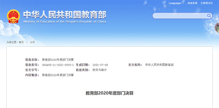 7月8日,教育部官方網(wǎng)站公布了教育部2020年度部門決算。決算文件顯示,教育部 2020 年度收入總計(jì) 48,443,630.19 萬元,支出總計(jì) 48,443,630.19 萬元。與 2019 年相比,收、支總計(jì)各增加1,175,582.76 萬元,增長 2.5%。
