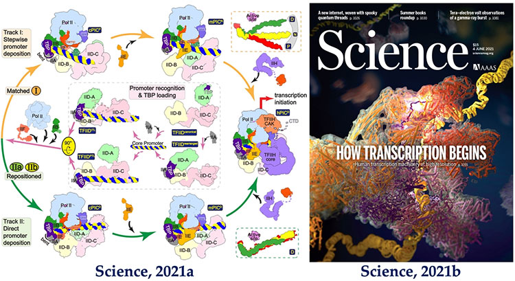 上述成果以2篇研究長(zhǎng)文發(fā)表于《科學(xué)》雜志(Science 372, eaba8490;Science 372, eabg0635),其中一篇被Science雜志選為封面文章,題目為“轉(zhuǎn)錄如何起始”。