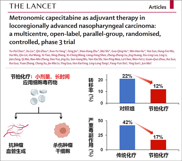 中山大學(xué)腫瘤防治中心馬駿研究團(tuán)隊(duì)提出了小劑量、長(zhǎng)時(shí)間口服細(xì)胞毒藥物卡培他濱的節(jié)拍化療模式,其可通過(guò)抗血管生成、殺傷腫瘤干細(xì)胞等機(jī)制持續(xù)抑制腫瘤,同時(shí)提高機(jī)體耐受性。馬駿教授通過(guò)牽頭一項(xiàng)多中心、前瞻性臨床研究發(fā)現(xiàn),在放療后使用“卡培他濱節(jié)拍化療”可將失敗風(fēng)險(xiǎn)顯著降低45%,且嚴(yán)重毒副作用發(fā)生率減少了3/5,完成率達(dá)74%。同時(shí)卡培他濱口服用藥方便可及,易于向基層推廣。
