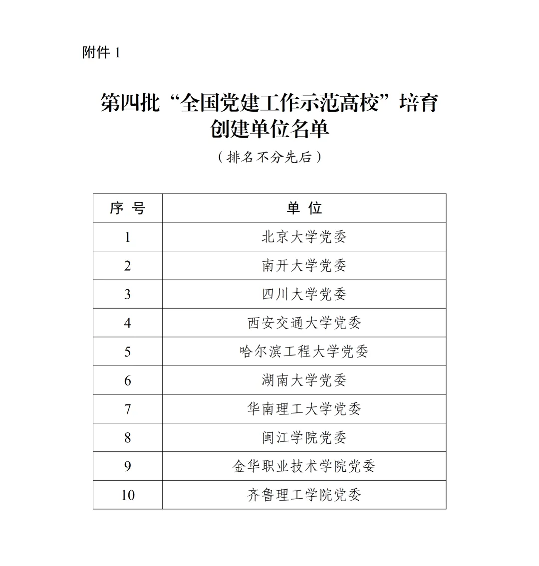 近日,教育部公布第四批全國黨建工作示范高校、標(biāo)桿院系、樣板支部培育創(chuàng)建單位名單。經(jīng)省級黨委教育工作部門推薦、資格審查、專家推薦、教育部黨的建設(shè)和全面從嚴(yán)治黨工作領(lǐng)導(dǎo)小組成員單位集中審議、結(jié)果公示,遴選產(chǎn)生了10個(gè)全國黨建工作示范高校、100個(gè)全國黨建工作標(biāo)桿院系、1001個(gè)全國黨建工作樣板支部培育創(chuàng)建單位。各培育創(chuàng)建單位建設(shè)周期為2年,自通知發(fā)布日起至2026年3月。一起來看名單——