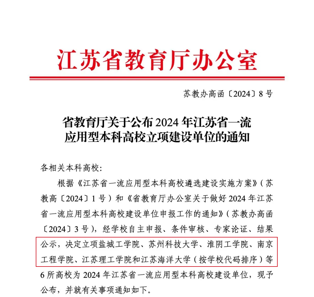近日,江蘇省教育廳發(fā)布了《省教育廳關(guān)于公布2024年江蘇省一流應(yīng)用型本科高校立項建設(shè)單位的通知》(蘇教辦高函〔2024〕8號),經(jīng)學(xué)校自主申報、條件審核、專家論證、結(jié)果公示,決定立項鹽城工學(xué)院、蘇州科技大學(xué)、淮陰工學(xué)院、南京工程學(xué)院、江蘇理工學(xué)院和江蘇海洋大學(xué)6所高校為2024年江蘇省一流應(yīng)用型本科高校建設(shè)單位。