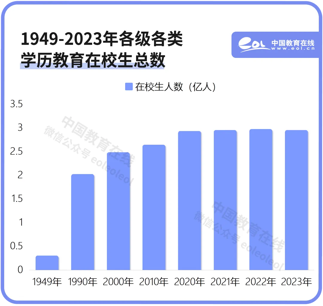 2023年,據(jù)教育事業(yè)統(tǒng)計數(shù)據(jù)顯示,全國共有各級各類學(xué)校49.83萬所,有2.91億學(xué)歷教育在校生,占人口總數(shù)的20.6%。