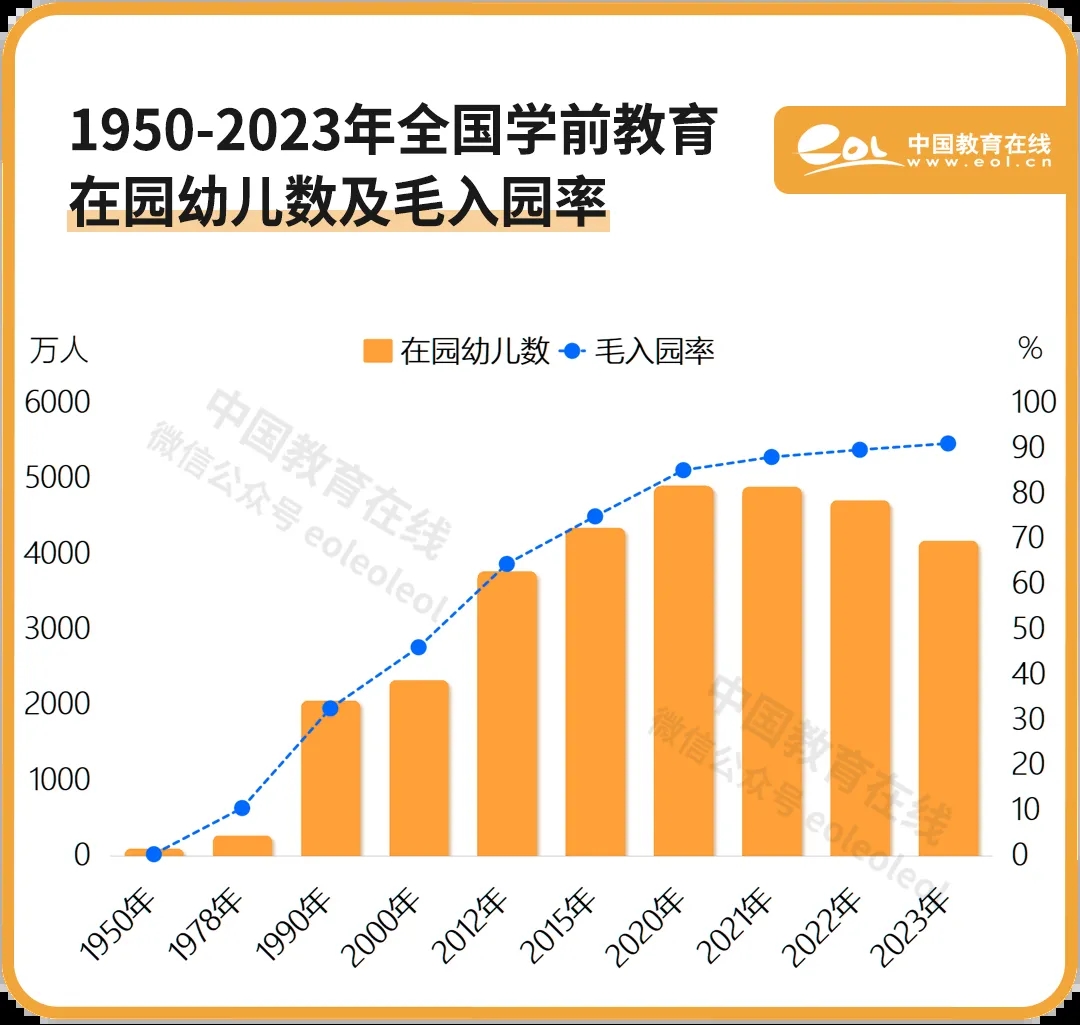 在園幼兒數(shù)從14萬人增加到2023年的4093萬人。