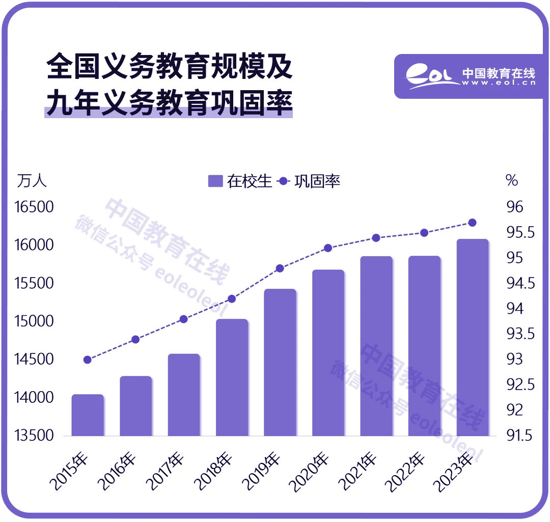 2015年,義務(wù)教育鞏固率為93%,到2023年,九年義務(wù)教育鞏固率95.7%,比2015年提高了2.7個百分點,義務(wù)教育擴優(yōu)提質(zhì)進(jìn)一步推進(jìn)。
