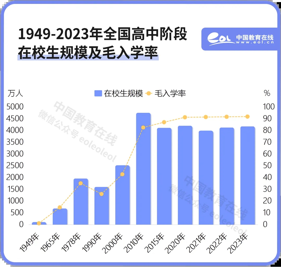 新中國成立初期,我國高中階段教育基礎(chǔ)非常薄弱,毛入學(xué)率僅為1.1%。2023年,我國高中階段毛入學(xué)率達(dá)到91.8%,比1949年提高90.7個百分點。