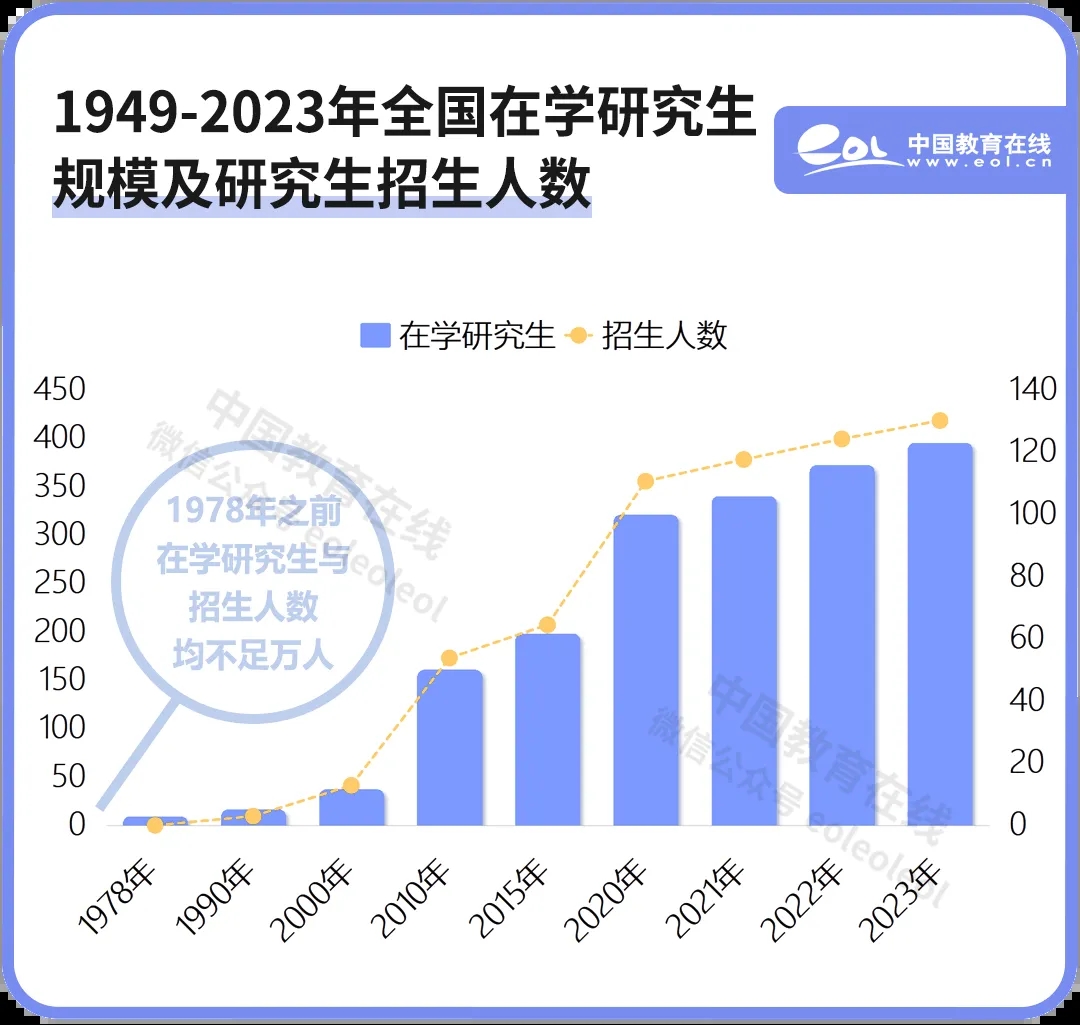 1949年,我國研究生在學(xué)人數(shù)僅為629人;到1978年突破萬人;1993年突破十萬人,2006年突破百萬人,2020年,研究生在學(xué)規(guī)模突破300萬大關(guān),2023年達(dá)到388萬人。