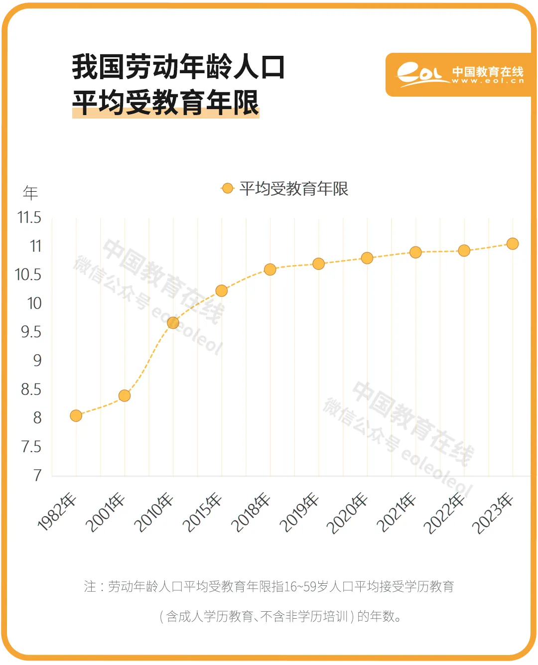 2023年,我國勞動年齡人口平均受教育年限由1982年的剛剛超過8年提高至11.05年,人才資源總量、科技人力資源均位居全球首位。