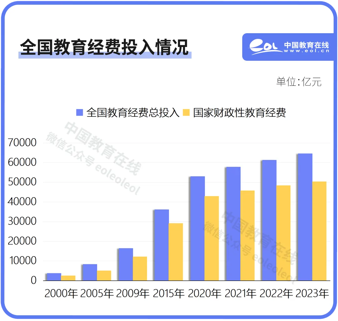 2023年,全國教育經(jīng)費總投入為64595億元,比上年增長5.3%。其中,國家財政性教育經(jīng)費為50433億元,首次超過5萬億元。