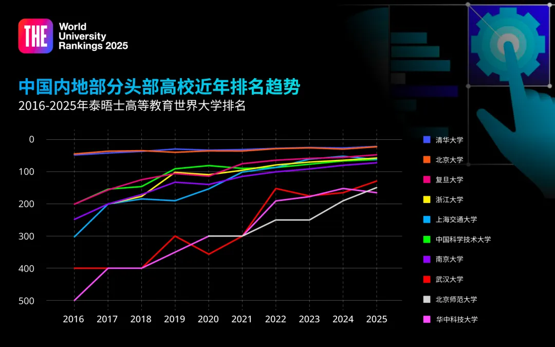 2016-2025年THE世界大學(xué)排名中中國(guó)內(nèi)地部分頭部高校排名趨勢(shì)