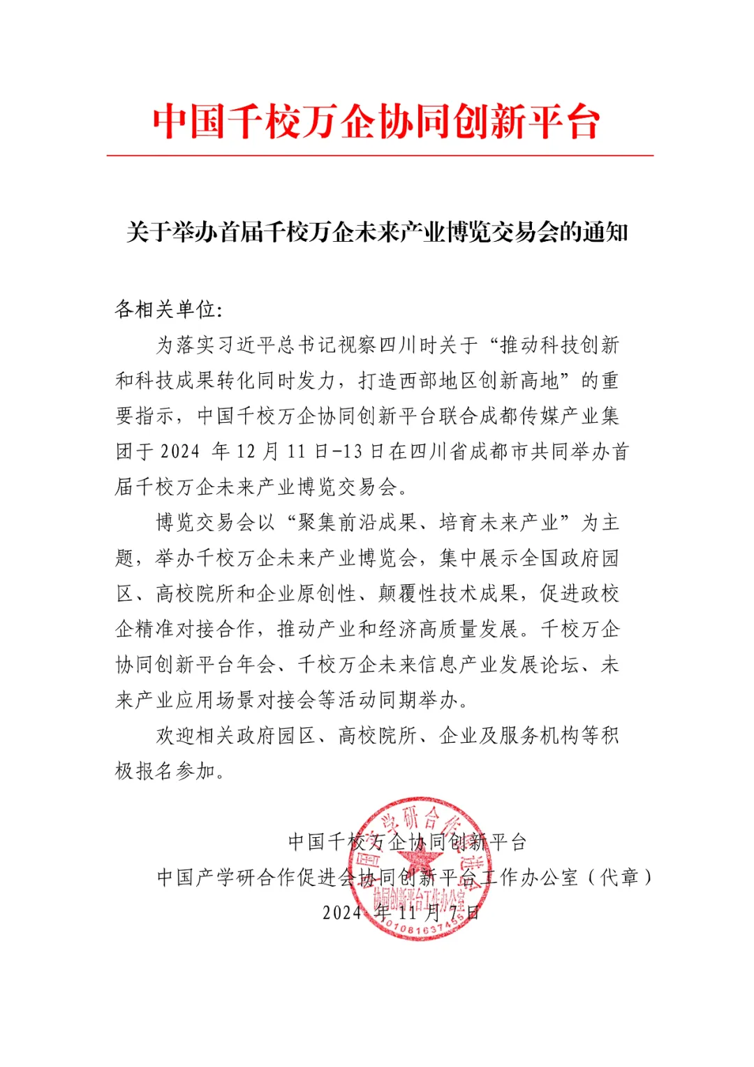 為落實習近平總書記視察四川時關于“推動科技創(chuàng)新和科技成果轉化同時發(fā)力,打造西部地區(qū)創(chuàng)新高地”的重要指示,中國千校萬企協(xié)同創(chuàng)新平臺聯(lián)合成都傳媒產(chǎn)業(yè)集團于2024年12月11日-13日在四川省成都市共同舉辦首屆千校萬企未來產(chǎn)業(yè)博覽交易會。
