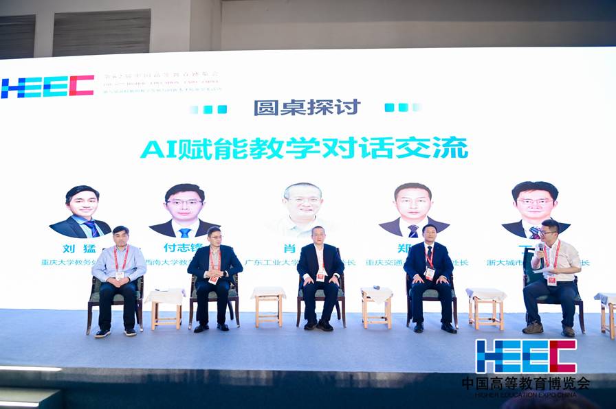 大會(huì)最后一個(gè)環(huán)節(jié)是主題為“AI賦能教學(xué)”的對(duì)話交流。重慶大學(xué)教務(wù)處處長劉猛、西南大學(xué)教務(wù)處處長付志鋒、廣東工業(yè)大學(xué)教務(wù)處副處長肖明、重慶交通大學(xué)教務(wù)處處長鄭丹和浙大城市學(xué)院教務(wù)處處長丁智分別就AI賦能專業(yè)建設(shè)、AI服務(wù)學(xué)生個(gè)性化學(xué)習(xí),教育主管部門支持教師持續(xù)發(fā)展等方面的問題闡述了各自觀點(diǎn)。