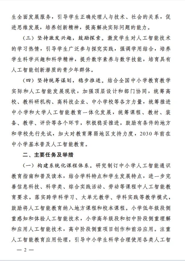 通知強(qiáng)調(diào),要加強(qiáng)頂層設(shè)計(jì)和部門協(xié)同,統(tǒng)籌推進(jìn)中小學(xué)和大學(xué)人工智能教育一體化發(fā)展,2030年前在中小學(xué)基本普及人工智能教育。