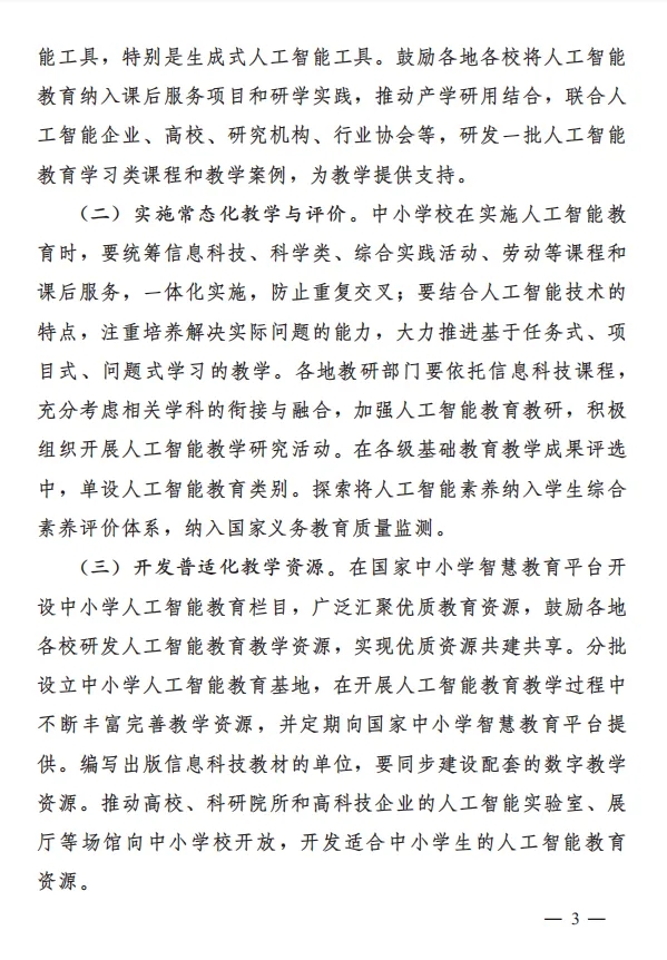 統(tǒng)籌相關(guān)課程和課后服務(wù),防止重復(fù)交叉。注重培養(yǎng)解決實(shí)際問題的能力,推進(jìn)任務(wù)式、項(xiàng)目式、問題式學(xué)習(xí)。加強(qiáng)AI教育教研,單設(shè) AI教育類別評(píng)選。