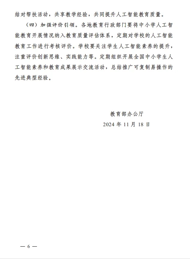 將AI教育開展情況納入教育質(zhì)量評(píng)估體系,定期進(jìn)行考核評(píng)價(jià)。關(guān)注學(xué)生AI 素養(yǎng)的提升,注重評(píng)價(jià)創(chuàng)新思維、實(shí)踐能力等。定期組織開展全國(guó)中小學(xué)生AI素養(yǎng)和教育成果展示交流活動(dòng)。