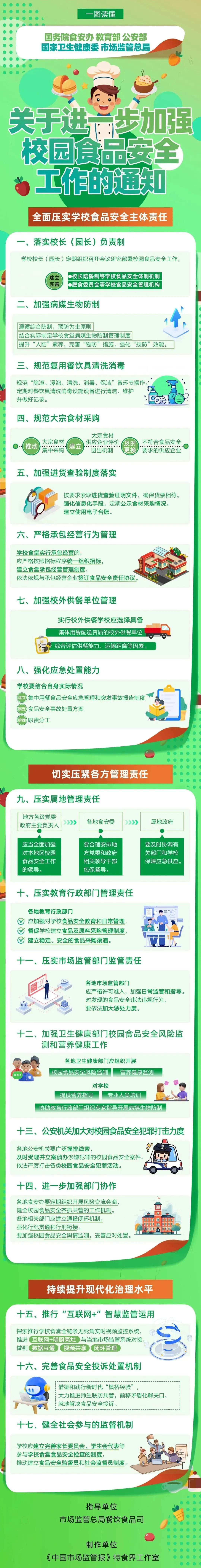 近日,國務(wù)院食安辦聯(lián)合教育部、公安部、國家衛(wèi)生健康委、市場(chǎng)監(jiān)管總局印發(fā)《關(guān)于進(jìn)一步加強(qiáng)校園食品安全工作的通知》(以下簡(jiǎn)稱《通知》),聚焦校園食品安全主體責(zé)任、管理責(zé)任和現(xiàn)代化治理水平,部署各地進(jìn)一步健全校園食品安全全鏈條防控風(fēng)險(xiǎn)的制度機(jī)制,強(qiáng)化校園食品安全保障。