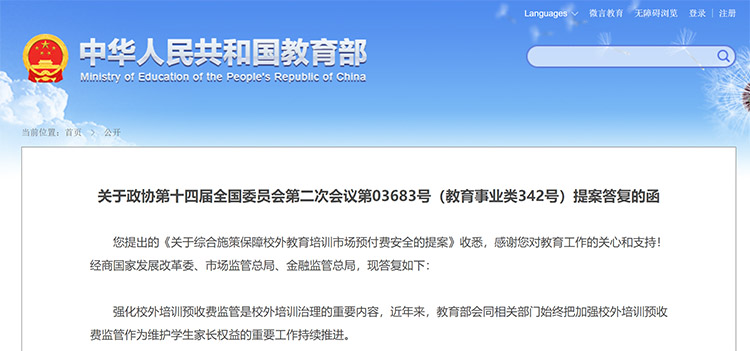 近日,教育部網(wǎng)站發(fā)布“對(duì)第十四屆全國(guó)委員會(huì)第二次會(huì)議第03683號(hào)提案的答復(fù)”,在答復(fù)“關(guān)于綜合施策保障校外教育培訓(xùn)市場(chǎng)預(yù)付費(fèi)安全的提案”時(shí),教育部表示,用好“黑白名單”制度,將培訓(xùn)預(yù)收費(fèi)情況作為校外培訓(xùn)機(jī)構(gòu)誠(chéng)信建設(shè)的重要內(nèi)容,依法依規(guī)嚴(yán)厲懲治違法失信行為,著力防范化解風(fēng)險(xiǎn),切實(shí)維護(hù)人民群眾的合法權(quán)益。