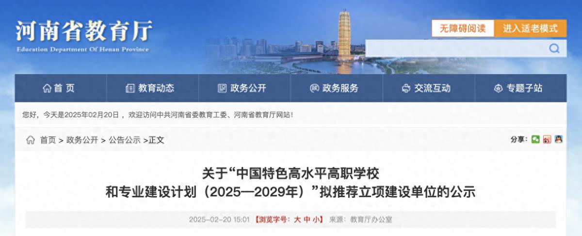 2月20日,河南省教育廳發(fā)布《關(guān)于“中國特色高水平高職學校和專業(yè)建設(shè)計劃(2025—2029年)”擬推薦立項建設(shè)單位的公示》。