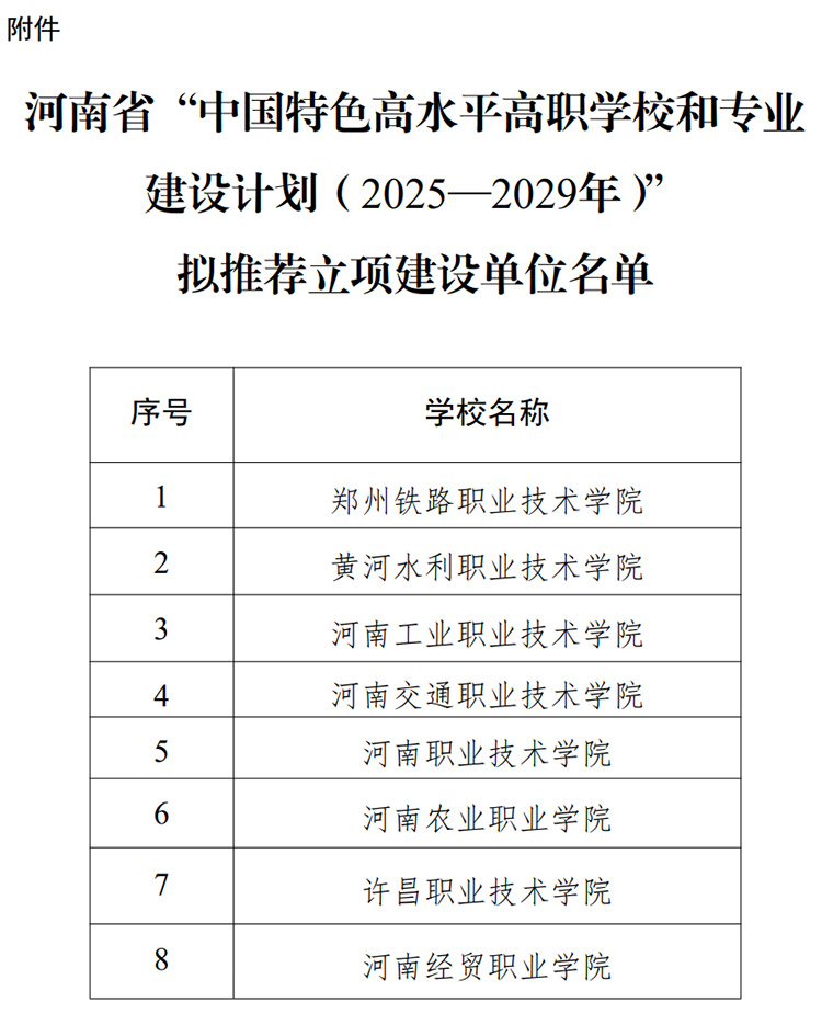 在第二輪獲推薦立項建設(shè)的8所高職院校中,河南交通職業(yè)技術(shù)學院與河南經(jīng)貿(mào)職業(yè)學院為新入選的“雙高計劃”推薦建設(shè)單位。