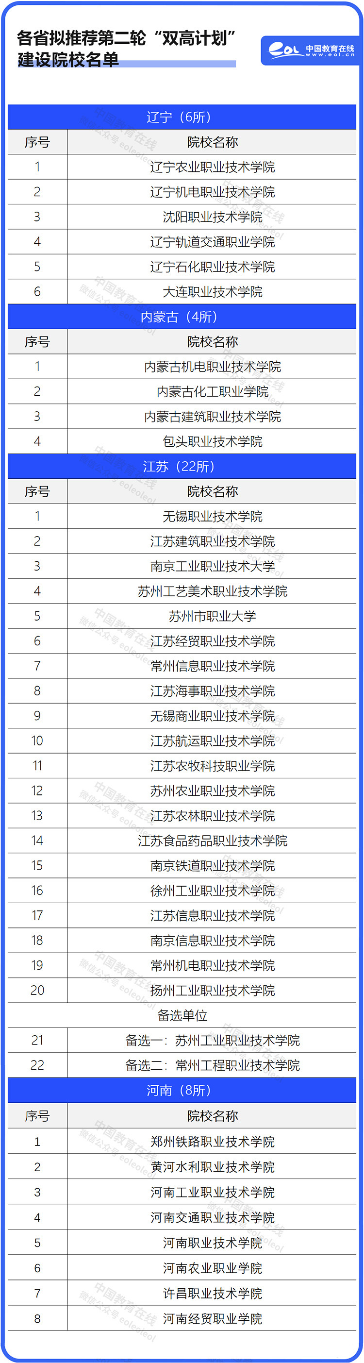 除河南外,近期,江蘇、遼寧、內(nèi)蒙古等地也公示了第二輪國家“雙高計劃”推薦名單。截至目前,已有40所院校(含備選)擬獲推薦進入新一輪“雙高計劃”建設(shè)名單。