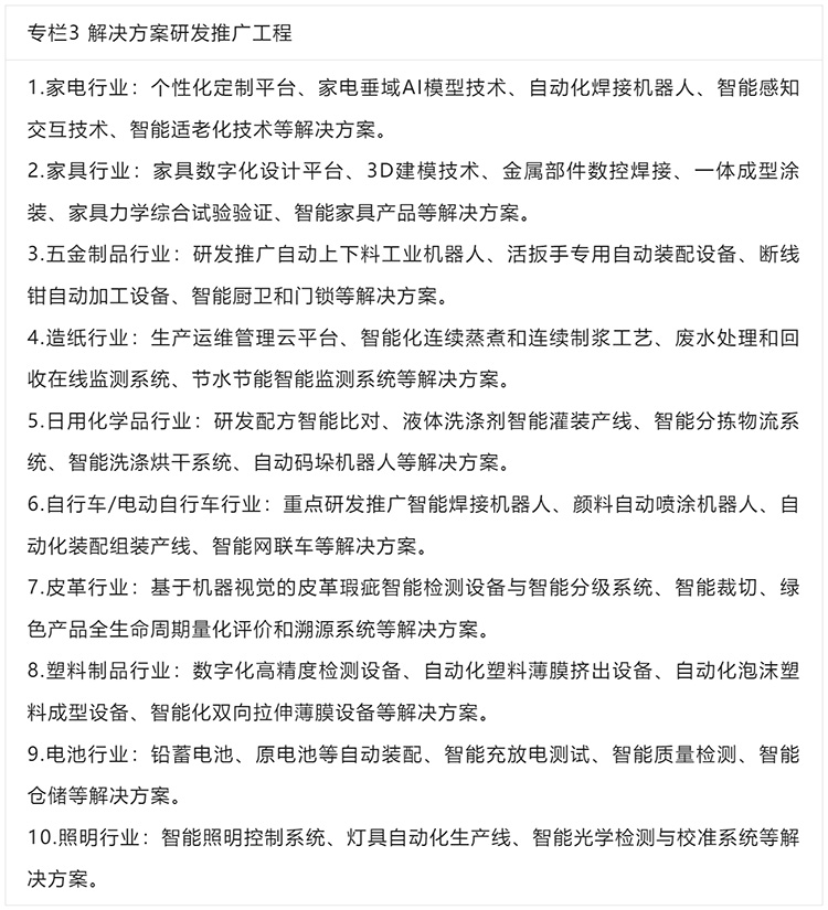 1.推動(dòng)高端化躍升。深化物聯(lián)感知、智能控制、人機(jī)交互等技術(shù)在家電、家具、照明、手表等終端消費(fèi)品的應(yīng)用,推動(dòng)智能產(chǎn)品跨品牌互聯(lián)互通。圍繞老人、兒童等重點(diǎn)人群,研究開發(fā)適老化智能家居、生活服務(wù)類機(jī)器人等智能產(chǎn)品。鼓勵(lì)家電、家具、皮革、五金制品等數(shù)字化基礎(chǔ)好的產(chǎn)業(yè)園區(qū),加快5G、工業(yè)互聯(lián)網(wǎng)、數(shù)據(jù)中心等新型基礎(chǔ)設(shè)施布局和規(guī)模化應(yīng)用,推動(dòng)園區(qū)內(nèi)配套企業(yè)間數(shù)據(jù)可信共享,打造高水平數(shù)字化園區(qū)。