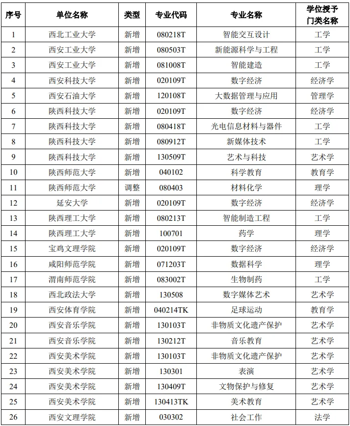 陜西省 2025 年擬新增學士學位授予單位及其新增授權專業(yè)名單