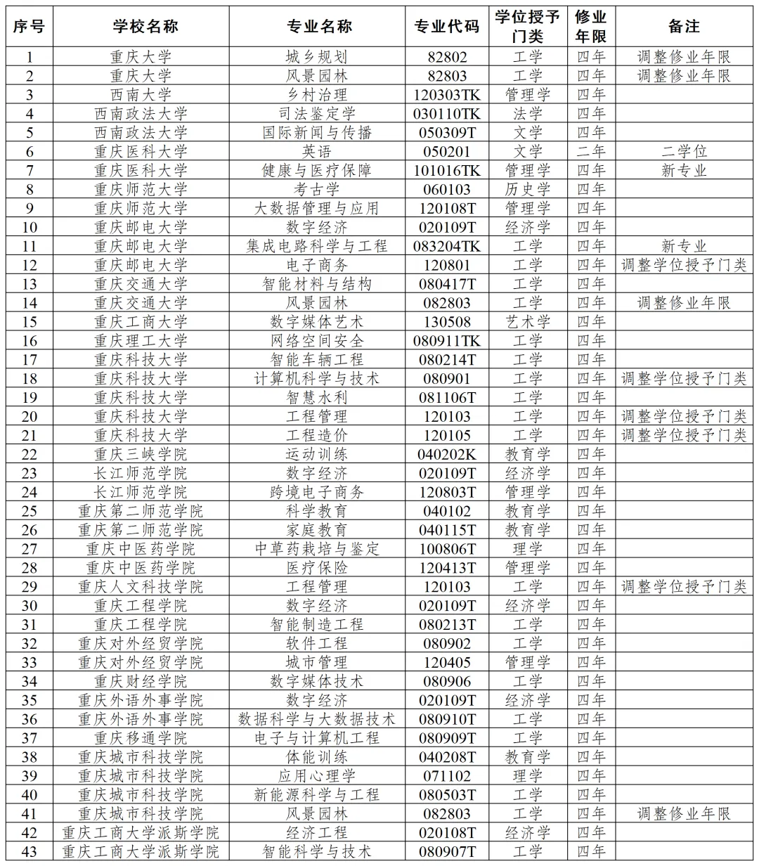 本次專業(yè)增設(shè)充分體現(xiàn)服務(wù)國家戰(zhàn)略和區(qū)域經(jīng)濟(jì)社會發(fā)展需求導(dǎo)向,在服務(wù)健康中國、西部陸海新通道建設(shè)等國家戰(zhàn)略方面,增設(shè)了健康與醫(yī)療保障、跨境電子商務(wù)、國際新聞與傳播等專業(yè)。在集成電路、人工智能、網(wǎng)絡(luò)安全等急需和新興領(lǐng)域,增設(shè)集成電路科學(xué)與工程、智能科學(xué)與技術(shù)、網(wǎng)絡(luò)空間安全等專業(yè)。在服務(wù)支撐重慶“33618”現(xiàn)代制造業(yè)、現(xiàn)代服務(wù)業(yè)、現(xiàn)代農(nóng)業(yè)等重點產(chǎn)業(yè)集群發(fā)展方面,增設(shè)智能車輛工程、智能制造工程、智能材料與結(jié)構(gòu)、數(shù)字經(jīng)濟(jì)、鄉(xiāng)村治理、智慧水利等專業(yè)。