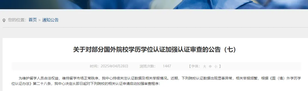 4月28日,教育部留學(xué)服務(wù)中心發(fā)布《關(guān)于對(duì)部分國(guó)外院校學(xué)歷學(xué)位認(rèn)證加強(qiáng)認(rèn)證審查的公告(七)》。對(duì)多所認(rèn)證數(shù)據(jù)出現(xiàn)顯著異常的國(guó)外院校(項(xiàng)目)的相關(guān)認(rèn)證申請(qǐng)啟動(dòng)加強(qiáng)審查程序。